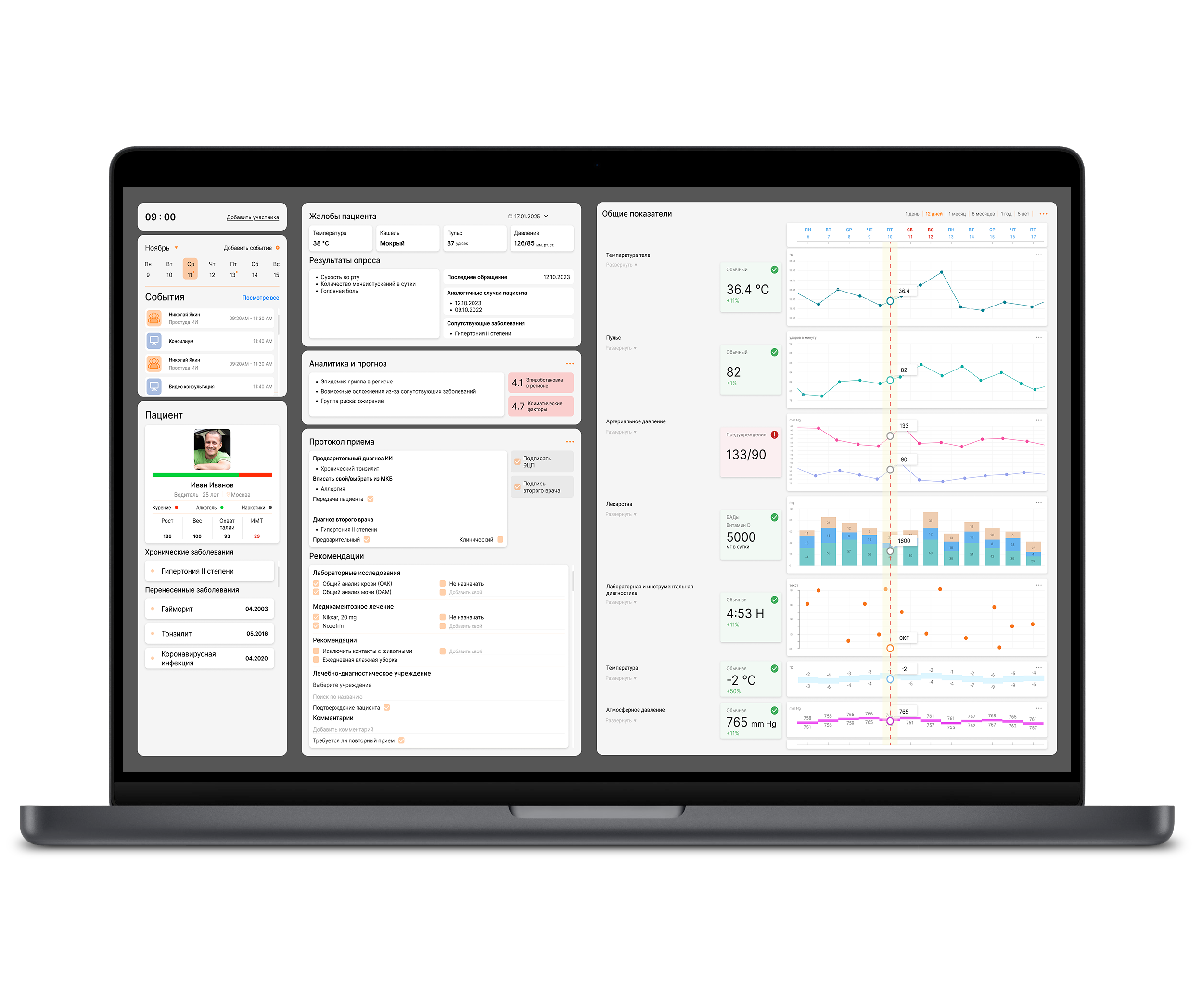 - системный мониторинг (сбор данных) и анализ показателей здоровья